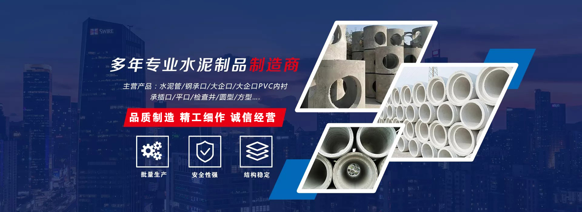 大连奘净建筑材料制造有限公司专业从事水泥制品的开发、各种型号、各种颜色的彩砖生产和销售。公司拥有国际先进的生产设备和技术,在业界率先使用芯膜振捣工艺,其产品在水泥管道界享有声誉。 公司引进国内外先进生产模具百余套,特殊模具60套。其强大生产设备从根本上保证了产品质量的稳定。另外公司还建立了自己的运输队伍,二十多辆货车整装待发。公司主要产品包括:水泥管、大口径水泥管、排水管、钢承口水泥管、钢筋混凝土水泥管、大企口、平口、承插口等,产品业内外人士一致好评。我们以诚信的经营理念,成为行业中企业,形成以水泥管为主导的管道制品产业链,百余个品种,精工细作的生产流程,完善的运输队伍赢得市场用户的青睐。大连奘净建筑材料制造有限公司可根据客户要求生产各种类型及不同档次的系列产品。不断创新,秉承着“专业、诚信、值得信赖的经营理念,本着“不与同行比价格,只与同行比质量”的原则大力发展。现已能够大规模自主设计 了解更多